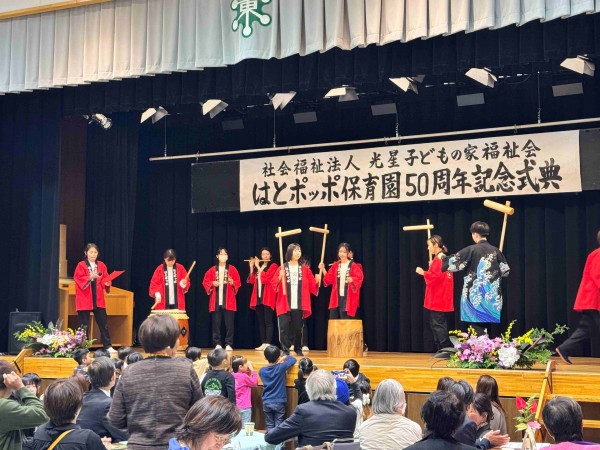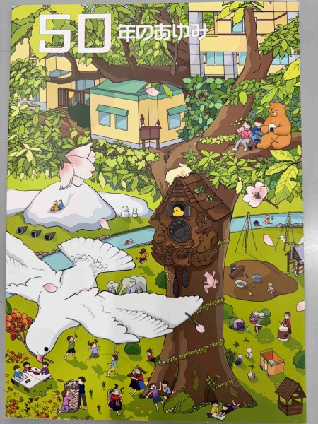 2月1日に50歳の誕生日を迎えるはとポッポ保育園は、11月29日に50周年記念式典を行いました。50周年という大きな節目に、たくさんの皆さまにお集まりいただき、心より感謝申し上げます。長い年月の中で園を支えてくださった皆さまや、お世話になった人生の先輩方のお姿もあり、とても嬉しかったです。子育て環境が大きく変わる現代において、子どもを理解するためには、その背景にいる保護者や、保護者を取り巻く社会を理解することが欠かせません。大人の価値観が先行しがちな今こそ、子どもの思いを最優先にし、子どもの権利が守られる保育を大切にしていきたいと思います。完成した記念誌にも思いが綴られています。これからの10年、20年、その先へと、はとポッポ保育園は歩み続けていきたいと思います。そして、もう一つ嬉しいご報告です!11月23日、園庭の壁画が完成しました!絆ガーデンをきっかけにご縁が深まった札幌大谷大学の皆さん。その中で、美術学部美術学科の卒業生で「株式会社となりで」デザイナーとして活躍する新井田早栄さんが、デザインから制作まで全てお一人で手がけてくださいました。50周年と聞き「壁画をつくってみては?」とご提案してくださり、材料費以外は無償で描いていただきました。本当に感謝の思いでいっぱいです。子どもたちからも感謝の気持ちを届けたいと思います。今後とも、はとポッポ保育園をどうぞよろしくお願いいたします。